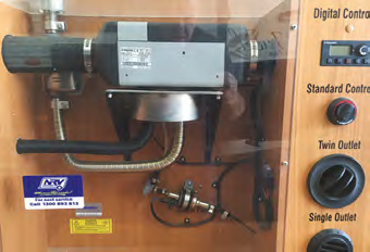 A diesel heater can be fitted in many areas but under the bed seems to be a favourite location and often it’s the most practical. The air intake is installed on the side of the bed with an outlet pointing directly down the centre of the motorhome to give maximum heating effect. The controller needs to be installed a little above waist height – halfway on a gable or cupboard – as this houses the thermostat. If you install it too low, the unit will keep running as the hot air is up near the roof and the reverse happens – if you install the controller too high it will cut out too early.