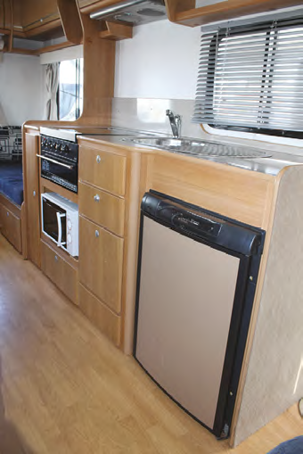 Once inside the headroom is very generous given the height that the roof line climbs to. Immediately in front of you is the first of two lounges, with a large window behind in the offside wall and provision for a table setting. The table top slots against the wall to your left following a vertical cupboard unit and behind where the ladder to the Luton bedroom fixes to the wall. There is a large drawer in the leading edge of the shorter arm of the L-shape setting, while the rest of the under-seat storage is taken up with the electrical system (see breakout, page 43). Above the window are three over head lockers that form part of a complete circuit around the interior in various sizes all in attractive timber, except for where broken by the bathroom placement – 13 in all! The right-hand one in this section lifts to reveal the switches and gauges keeping tabs on the hot water, pump and tanks and the radio/CD player for the ‘house’ sits beneath this collection – there are also speakers on the outside wall.