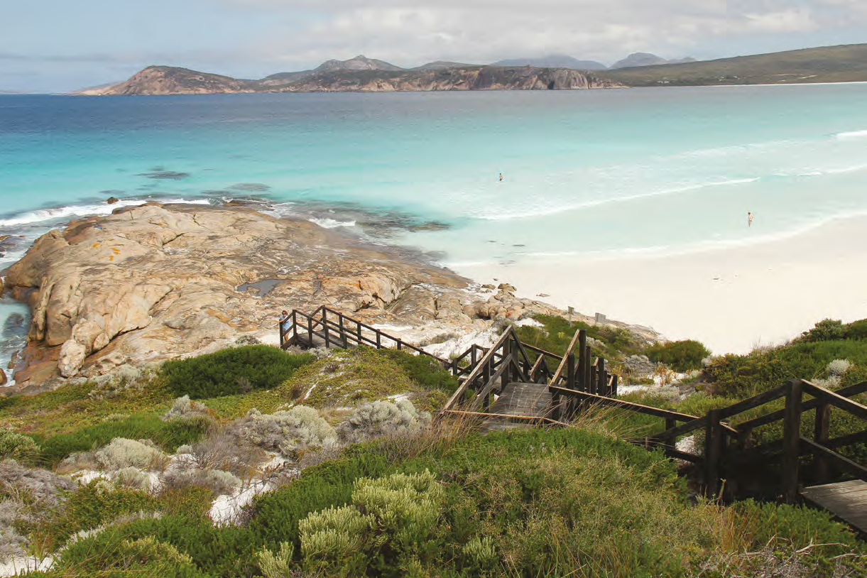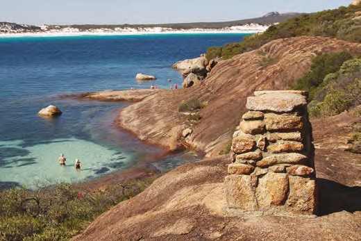 Massive rocky outcrops, long stretches of pristine, white sandy beaches and the clearest turquoise water you will see anywhere, are features of this attractive area overlooking the Southern Ocean. An impressive chain of granite peaks, including Mt Le Grand (345m), Frenchman Peak (262m, and said to resemble the shape of a Frenchman’s cap) and Mississippi Hill (180m), stand as imposing monuments above the undulating heathcovered sand plains that make up most Cape Le Grand National Park’s 32,000 hectares. Carved out by erosion and the action of the sea when ocean levels were much higher, millions of years ago, some of the caves and tunnels found in the park’s rocky outcrops offer bushwalkers and modern day explorers much to keep them interested and entertained.