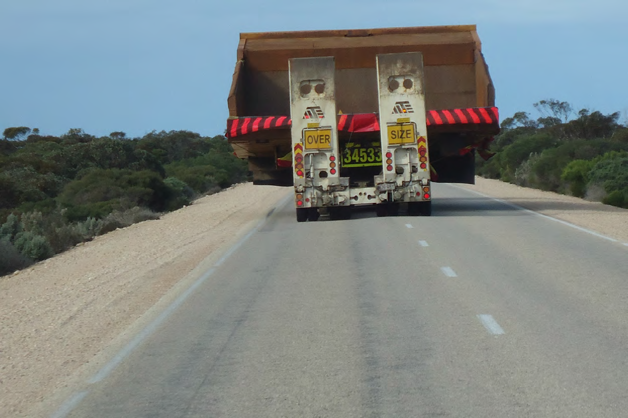 All other vehicles, including road trains, cattle trucks, motorhomes and campervans must give way to the oversize load, specifically on the approach to bridges, narrow roads though hazardous terrain.