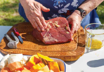 Place a couple of tablespoons of olive oil on the bottom of your cast iron camp oven. Combine the remaining olive oil with the crushed garlic and rub the mixture over the meat. Place the meat inside the oven on the trivet and cover with the lid.