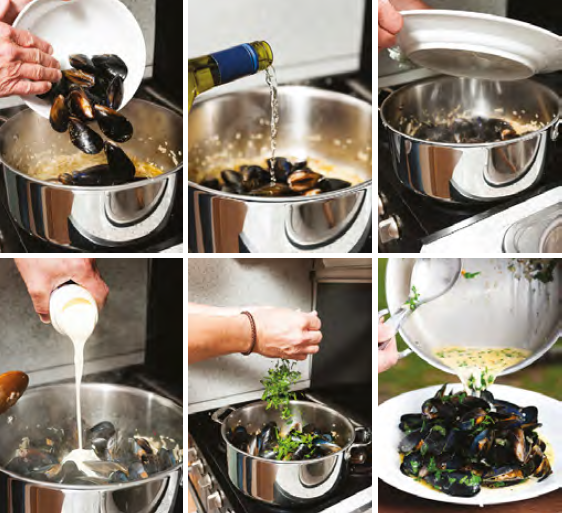 If there is any cooking liquid left after you have eaten the mussels, don’t throw it away. Cool and refrigerate it; this is a great base to poach a piece of fish in the next day.