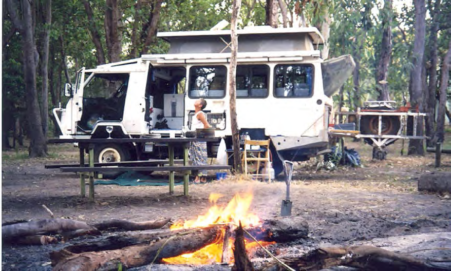 Despite the ongoing 40.C whilst camping in Kakadu National Park, we still baked fresh bread most days - it’s in a Bedourie oven under that spade; that also warns not to walk there barefoot! The 71 litre eutectic style fridge (visible through the entry door) coped with ease - drawing a mere 40 amp hour a day from two (nominal) 80 watt solar modules above the driving cab. The fly mesh screened rear window provided ample air movement at night. Pic: Author 1998 (Pix copyright Caravan & Motorhome Books).
