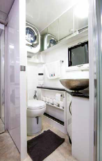 There are some slide-out based motorhome layouts I have seen where the slide-out looks a bit like an afterthought rather than being integrated into the overall design. Not here, because built into the slide-out, working from rear to front are an east-west queen bed, fridge with microwave oven above and, up front a sideways facing lounge. Of course the driver’s cab seats swivel around, thus forming an area for lounging and dining – the sideways lounge having a detachable table, which is stored under the bed when not being used.