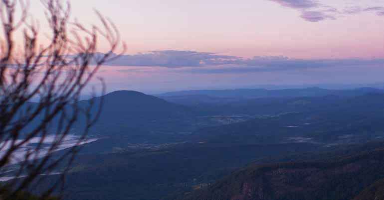 The sky was blessedly clear and the first glow of dawn glittered on the horizon and bled across the eastern sky, where only the most radiant of the stars were still hanging on. The lights of the Gold Coast and Byron Bay twinkled knowingly on the coast, despite the fact most of their residents were still tucked away in bed at this ungodly hour of 5.30am. The Tweed River snaked its way sleepily towards the sea like some mythical creature reluctantly slinking into morning, a blanket of fog hanging over the valley through which it weaved hundreds of metres below us. The early dawn light captured every particle of the sea mist that lingered over the ocean, a palate of gold, pink, and inky blue in which it was almost impossible to discern ocean from sky from land. I stood mesmerised for a long while trying to do so before finally accepting this surreal vision for what it was: impossibly beautiful.