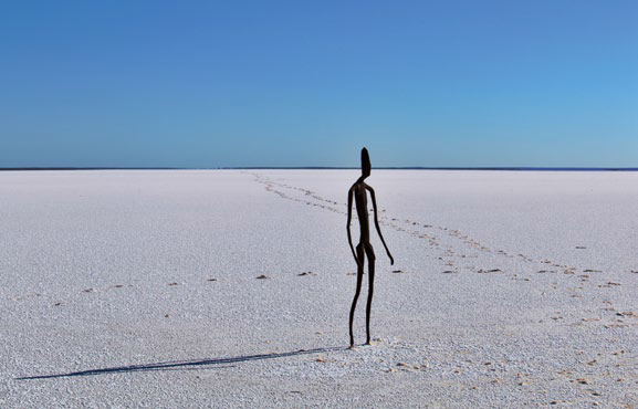 Gormley wanted to find a human equivalent for this very geological place. The 51 works are positioned about 750 metres apart, installed on the western end of Lake Ballard. The horizon is flat for most of its 360 degrees. There is an ironstone mound 120 feet high that allows a vantage point to see more than 30 kilometres in any direction.