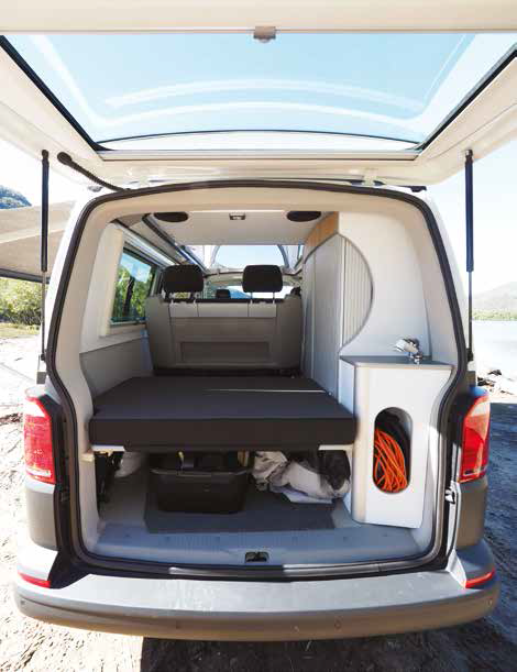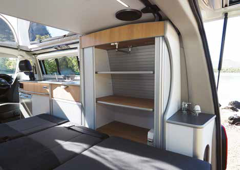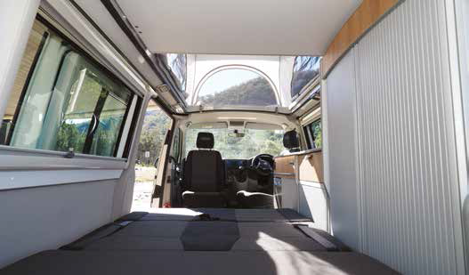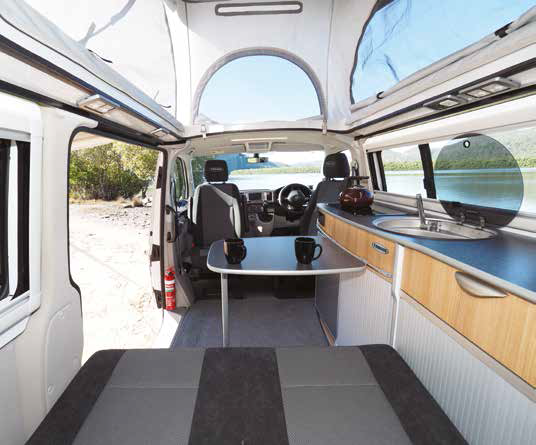 Both cab seats swivel around, there’s a kitchen bench/wardrobe unit along the offside, a day/night lounge seat mid van and a large shelf built into the van roof in the rear. With the roof up, the large screened windows offer plenty of ventilation. A standard VW opening window is fitted into the sliding door and above the kitchen bench on the opposite side – it’s very useful if the weather is poor but some ventilation is still needed.