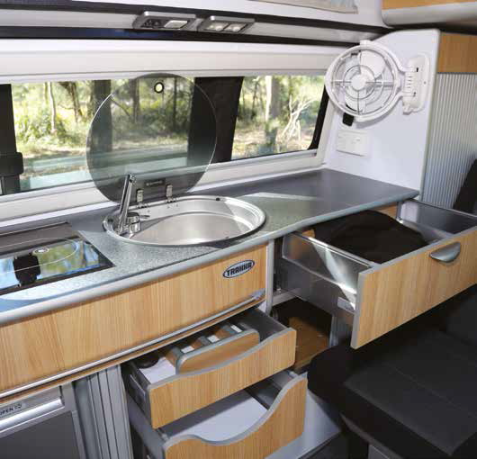 Many travellers will probably live alfresco but inside, both the swivelling cab seats and the rear seat offer plenty of room to stretch out – at least for two people. Even with the bed made up, there’s still seating for two in the cab seats. Simple is how you’d describe the Trakkadu’s catering facilities. It comes with a Webasto diesel-fired cooktop, an underbench Waeco 80L fridge to keeps things cool and the stainless steel, glass lidded washing up bowl. General storage consists of three drawers and a purpose built storage with both plate and cup racks. At the forward end of the bench above the fridge are the Trakka electrical control panel and the Webasto cooktop controls. I like the electronic control panel – everything neat in one place. A clipon table can either be fitted to the kitchen bench and be used at both front and rear seats or used outside, by clipping on to the sliding door.