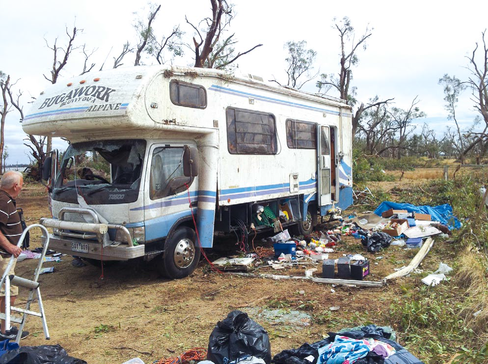 I looked around; the Reserve looked like ground zero. All the huge gums had been reduced to stumps; there were motorhomes and caravans everywhere. There was machinery trying to clear a track in but it was a big task to move all the trees out of the way. Off in the distance along the Mulwala-Corowa Road we could hear more machinery and there were a lot of red and blue flashing lights. We heard that there was a couple trapped in a caravan with a big tree on top of it and nobody could get to them until a track was cleared. The red and blue flashing lights on the Corowa Road were ambulances trying to get to us. It took them about two hours to get to where we were, only about 200 metres off the bitumen.