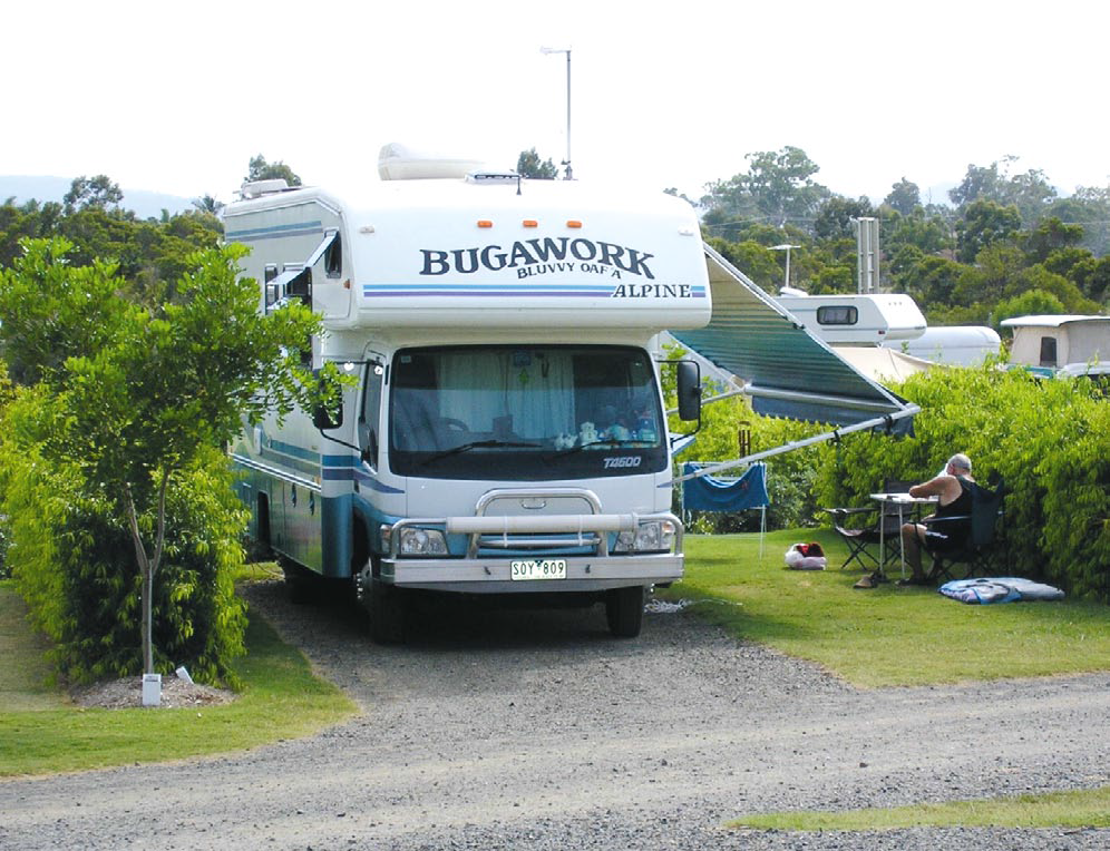 I didn’t like the look of the sky so I turned off the two, nine kilogram gas bottles, went inside, closed the door, windows and hatches, and turned off the TV and inverter. This was the first time I had done this in the nine years that we had been on the road. We were on the settee when off in the distance small branches appeared to break off the trees and float away. About three seconds later there was a terrible roar of wind, we had never heard anything like it before, and suddenly great huge gum trees were going in all directions. Eileen screamed as a big tree came towards us and hit the Mazda T4600 cab of the vehicle.