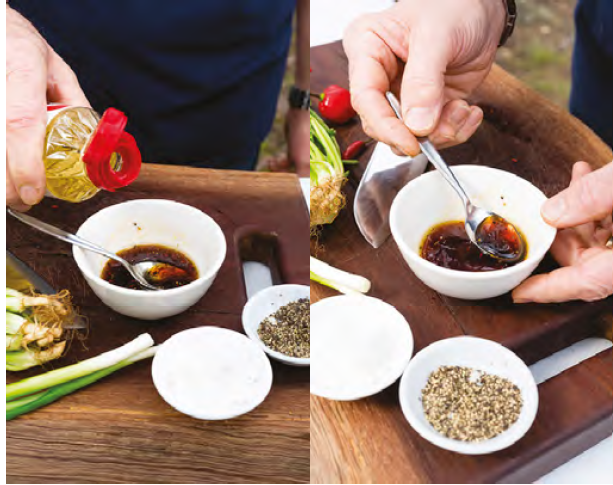 Place the Mirin, soy, sesame oil, chilli, coriander, salt and pepper in a small bowl and stir to combine.