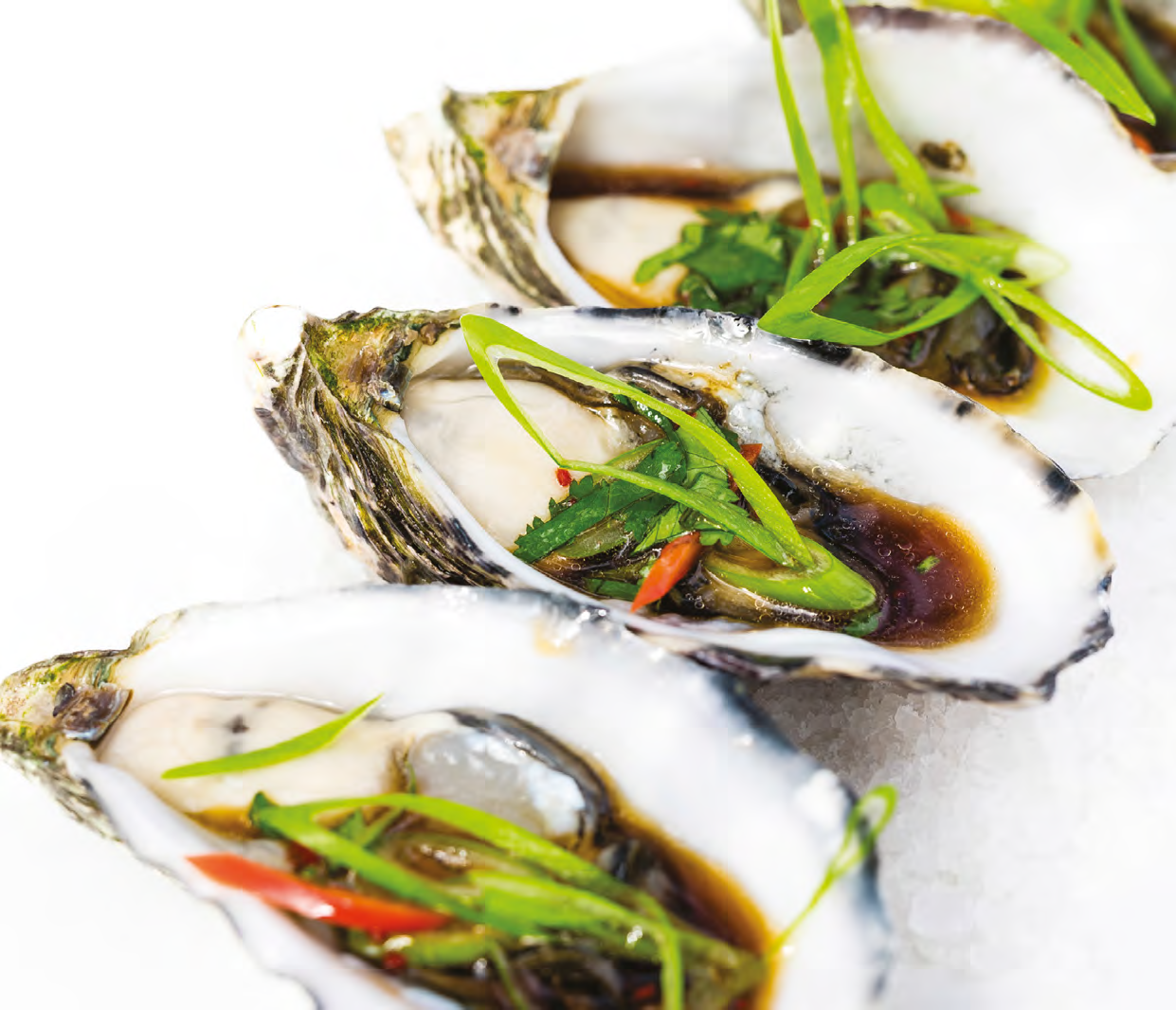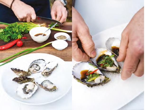 Place your oysters on a serving platter then coat each oyster with a little of the sauce and garnish with a few slices of the spring onion.