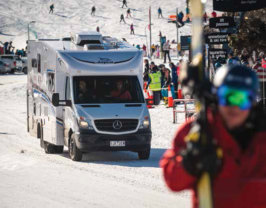 All the gear you need for your mountain escapade is just one part of the equation – the other is how to drive up, and down, the mountain safely. Driving on icy or snow-covered roads is a completely different proposition to regular, everyday driving, so it’s imperative you know what you’re doing. The most important thing is to drive in manual, rather than automatic, and to use the gears to slow down the motorhome rather than the brake. You really want to avoid braking as much as possible, preferably at all. Use of the gears to control the speed should be done early, as their ability to slow a vehicle is far less effective than a brake. On steep descents, keeping the speed and gear very low at the start on the hill will ensure the vehicle is travelling at a safe speed further down. Many modern motorhomes, such as the Conquest Play, have an automated manual transmission (AMT) which means it can be driven in manual or auto. We found the Conquest Play’s seven-speed AMT gearbox super smooth and definitely capable of handling the steep terrain of Mt Hotham. If you do start to skid on ice in your motorhome, you have a split second to work out what is causing you to skid and to stop doing it. If you’re braking, don’t brake harder; if you’re accelerating, gently ease off the accelerator. If the situation becomes dire and the safety of yourself or your passengers is severely compromised, your last option is to purposely ditch the motorhome into a snowbank or another natural feature to save you going off the side of a mountain!