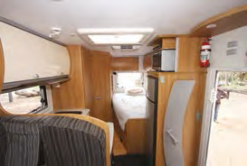 Designed in a quite a compact arrangement, the kitchen bench has a Smev three-burner cooktop against the wall and a stainless-steel sink at right angles to that with a circular drainer in between. That doesn’t leave any room for benchtop area but the sink and cooktop have smoked glass lids. Under the sink and facing the entry door opposite is a Smev grill oven. The remaining under-bench area is devoted to general storage with a cupboard, cutlery drawer and floor locker. Two overhead lockers offer more kitchen storage. Those other kitchen essentials, a three-way 190-litre Dometic fridge with microwave oven above are opposite the kitchen bench, between the entry door and the bed.