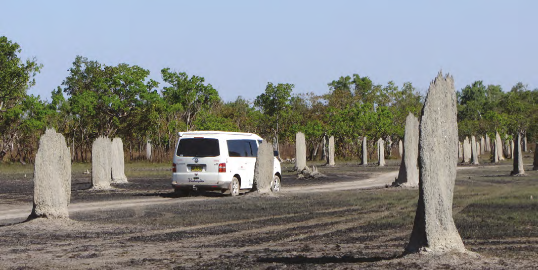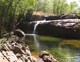 Our last stop before leaving the Top End was the famed Litchfield National Park. The park is bookended by fields of magnetic termite mounds. The mounds are broad and thin and are aligned north-south so that one face is always in the shade. This enables the termites to regulate the temperature inside. We entered Litchfield from the north via Berry Springs. It’s the shortest route from Darwin but involves 25km of pretty ordinary corrugated road (its condition probably varies depending on when it was last graded). Litchfi eld isn’t a big park and we saw all the popular sights (those accessible by sealed road) in two days, including the Wangi, Tolner and Florence falls. Despite the presence of freshwater crocs, Wangi and Florence have lovely plunge pools that are okay to swim in. We left the park through the southern entrance and headed back towards Katherine via the Douglas and Daly region. This is the scenic alternative to the Stuart Highway and passes more hot springs.