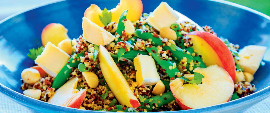Toss the quinoa, green beans, parsley and shallot together in a bowl. Place these into a sealable container; place the nuts into another container; keep the peaches and the dressing separate until you’re ready to eat. Keep the brie in one piece until you are ready to serve the salad.