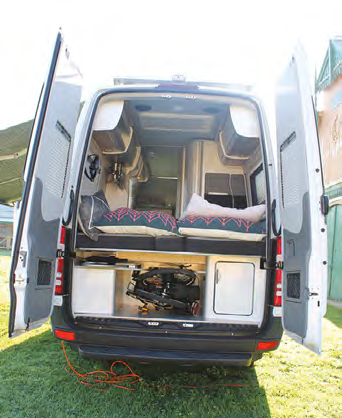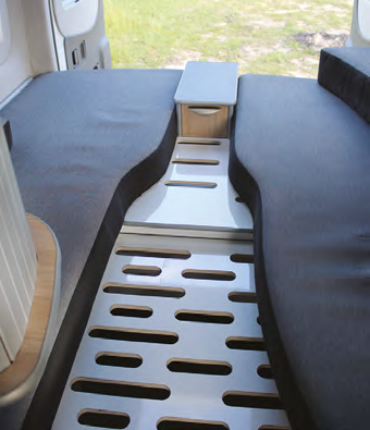 The bedroom offers you layout choices; two north-south singles or, with the central placement of three contoured cushions, a double. However, when used as two singles (by default a pair of lounges) a central laminate section can accommodate a slotin bedside drawer. This drawer can live in the hanging space/wardrobe at the foot of the bed if not required – it has slots there too. I can vouch for the comfort of the memory foam mattresses and the length at more than two metres should be more than adequate for most users. You might wonder how the bedroom doubles as the (carpeted) rear dining area. The laminate panel that slides out to hold the dropin cushions for the expanded mattress retracts to allow either free space or the positioning of a dining table. This larger table uses the same post that holds the other but both table tops have dedicated slide in holders within and below the bed-end wardrobe.