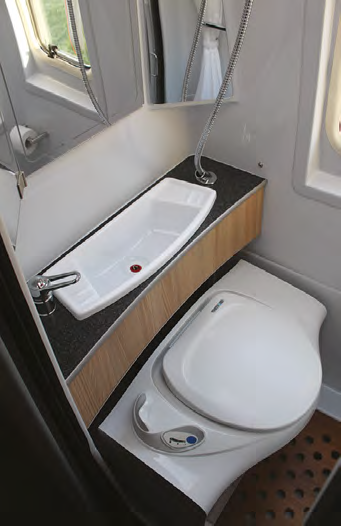 The Waeco 12/240V fridge and microwave module is next on the offside with the latter also behind a roller door which means light items can be stowed alongside it. There is one more storage cupboard beneath the fridge that sits on the box required to house the Thetford electric toilet that lives next door in the bathroom.