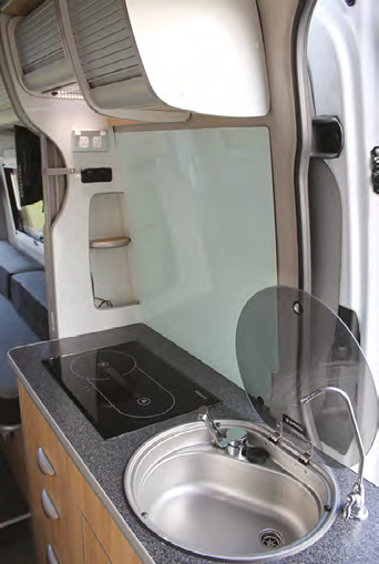 As mentioned, the control panel is behind a roller door on the overhead bank above the kitchen. There is a display for the Truma hot water and vehicle heater settings; the cooktop on/off and temperature dial and one for the fridge. On the left is a display for the battery health and water tank levels, and buttons for the water pump, the 12V circuits and the exterior lights. Above two small shelves on the kitchen wall at left are two 240V outlets and 12V/USB ports. There is an identical fitting behind the driver’s seat above the bench.