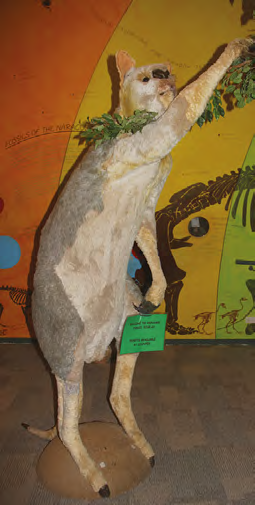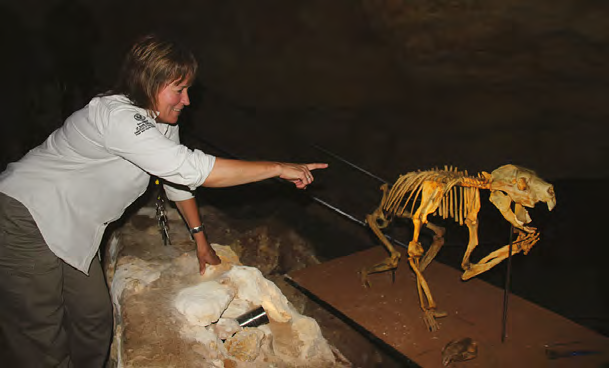 In the background of this display, deep within the cave, is an archaeological site where ongoing work by palaeontologists is being painstakingly carried out. The earthen silted cave fl oor contains the fossilised skeletal remains of around 135 different species of large and small creatures which, in an intriguing tale of mystery and mishap, it is revealed tragically (for them) how they fell through a small concealed cave opening at ground level and, because of the depth of their fall, were unable to climb out.