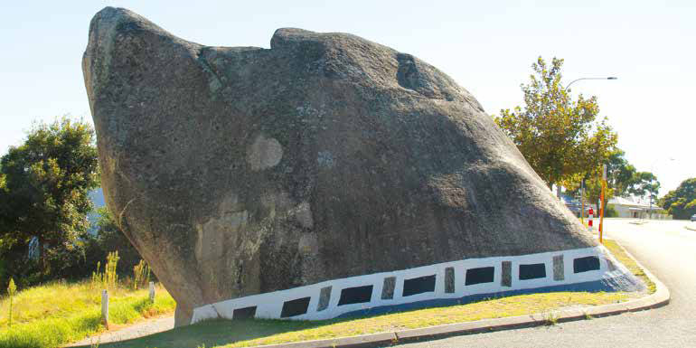 Standing not far from the centre of town on the verge in Middleton Road is Albany’s well-known local icon – ‘Dog Rock’. Bearing an uncanny resemblance to a dog’s head, the rock now sports a distinctive painted collar around its ‘neck’. This well-loved canine apparition (looking quite like a Labrador sniffing the air) is, in fact, one of the most photographed landmarks in this very scenic coastal town. Dog Rock, however, is not just a rock sitting on the ground here in Middleton Road. It is the tip of a huge underground granite boulder protruding through the earth’s surface. This is a ‘must see’ on any visit to Albany.