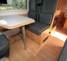 Up front, the driver’s seat swivels around to mate with the table and the two seater on the opposite side. Although designed for two when travelling, it is definitely more comfortable for one person at other times. For getting the most usable position, the table will slide back and forwards.