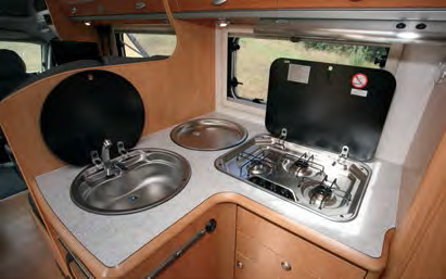 For the general layout, there’s a full lounge/dining area that incorporates the front swivelling seats, a smallish offside kitchen, mid-sized bathroom and a rear nearside corner bed. 12V LED light fittings are fitted in mostly logical places and give a good general illumination. An interesting feature of the Ovation is that it comes with a mini home theatre sound system which goes with the TV and DVD player, but oddly enough not with the radio - the motorhome only has the driver’s cab radio/CD player.