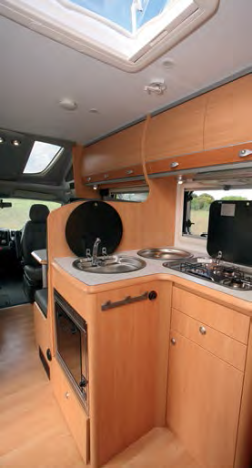 Out of sight on the roof are the TV antenna, an Air Command Ibis air conditioner and an optional 80W sound system. Also out of sight are the 95 amp hour deep cycle battery and the 18 amp battery charger - they are located below a floor hatch that sits underneath the table. For the general electricals, A’van has fitted their standard control panels by the entry door.