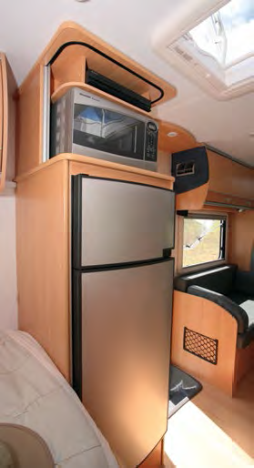 Designed in a quite compact arrangement, the kitchen bench comes with a Smev three burner cooktop against the wall and a stainless steel sink sitting at a right angle to that, with a circular drainer in between. That doesn’t leave any room for bench top area, but both the sink and cooktop have smoked glass lids. Although not universally popular, a hinged flap at the bench-end would aid tasks like the washing up. Located under the sink and facing opposite the entry door is a Smev grill oven. The remaining under bench area is devoted to general storage with a cupboard, cutlery drawer and floor locker. Two overhead lockers offer more kitchen storage. A three way 190 litre Dometic fridge with microwave oven above are located opposite the kitchen bench, between the entry door and the bed. A nice touch is the roller shutter door that closes off the microwave oven when not being used.