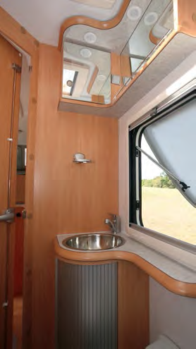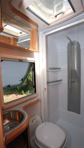 A large roof hatch and medium sized window improves the bathroom’s space perceptions considerably, as does the mixed decor with the curved lines of both the cabinet and overhead lockers. There is just enough room for a shower cubicle, Thetford cassette toilet, wash basin along with storage cupboard and shaving cabinet. Generally speaking, the bathroom layout works quite well.
