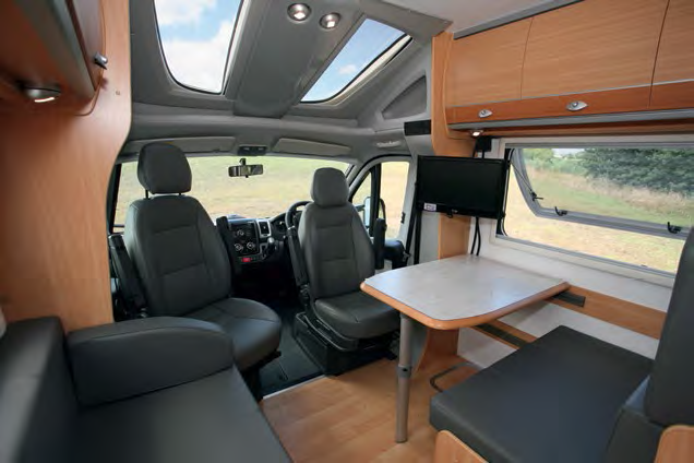Stepping in through the entry door, a light hued timber look is revealed that has been used throughout. It isn’t too overpowering and plenty of window area gives a good level of natural light. Optional leatherette upholstery is used for all the seating, including the driver’s cab.