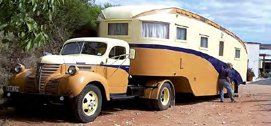 The 13 metre long ‘Highway Palace’ was built in the mid-1940s for Harry Parr and his wife Daisy of Pinnaroo, SA, by Grace Brothers of Adelaide (a construction company) that built two standard fifth wheel caravans. The ‘Highway Palace’ was a ‘one off’, costing over £2000, a huge sum then. The tow vehicle is a Dodge Fargo. Both were meticulously restored by Dick Hart and his friends after the caravan was found in a serious state of disrepair. Pic: courtesy of Dick Hart.