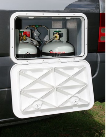 The entire sleeping area is on a raised platform, which allows a discrete ?oor-level drawer to be ?tted as well as a storage compartment that’s readily accessible from both inside and outside via the rear doors. Part of this area is taken up by the gas cylinder bin and also, in this case, the optional diesel space heater.