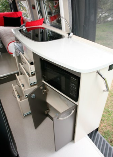 There is a bit of compromise required again in the kitchen, which is ?tted with an under bench 110L Waeco fridge to allow space for a three-burner combo cook top and stainless steel sink, both with smoked glass lids, and some precious bench top working space. Also ?tted under the bench is a microwave, along with a double cupboard and four storage drawers. There wasn’t a grill or conventional oven ?tted to our review van but they are available options.