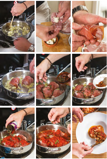 Now add thigh fillet parcels to the pan, along with the capers and olives, then pour over the tinned tomatoes making sure you cover the chicken. Rinse the tin with 150ml of water and add to the pot.