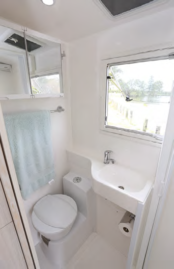 Getting a bathroom into a smallish motorhome is going to require a deft hand with design and a bit of compromise. The latter isn’t too obvious with the Dometic cassette toilet fitting into the rear right-hand corner and the shower cubicle on the opposite side. The door frame of the shower cubicle crosses the rear window frame but that allows good ventilation and leaves enough space under the window for a wash basin. Filling the wall space above the toilet are a shaving cabinet and towel rail.