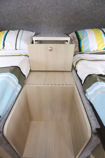 Up front is where the happy compromise of the bed design is to be found. By day, the single beds are pushed back into the Luton peak area but at night time, the 2.0m x 0.69m (6ft 7in x 2ft 3in) beds can be pulled out into the air space above the kitchen bench and the lounge.