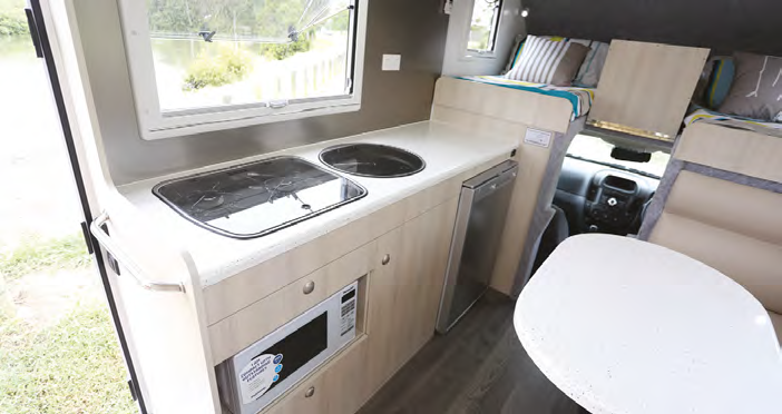 For the travelling chef, the kitchen bench comes equipped with a three-burner cooktop, a round stainless-steel sink, an under-bench microwave oven and an under-bench 136-litre Waeco fridge. The cooktop and sink have smoked-glass lids but there isn’t a grill or a drainer for the sink. Fitted in under the kitchen bench are two drawers, one for cutlery and a cupboard area that includes two wire basket drawers.