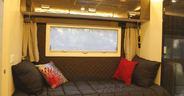 One of the striking features about the Navian’s interior are the gloss finishes to the cupboards and the fridge and wardrobe doors that are opposite each other and divide the living and bedroom areas. Along with the laminates for the lower sections of storage it’s part of one of several decorative themes – with curtains and fabrics if you omit the leather – you can choose for your vehicle.