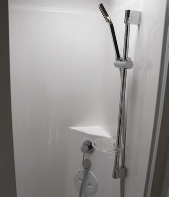 The full-length hanging space is an often missing unit and for internal storage in the bedroom area it’s augmented by three overheads on the near side and an underbed cupboard on the offside that is also accessible from outside. The offside bed is within the slide-out unit that because it’s a single in the N512 means that when retracted there’s access to the rear side-to-side bathroom, with itself comes with a standard wall-mounted washing machine. The toilet area is well served with shelves, and a nice basin layout plus a window and great strip lighting. The shower cubicle is equipped with domestic quality chrome fittings and a powered roof vent while the whole area can be screened off with a concertina retractable door, albeit with a fiddly press stud clip. The only issue when visiting the bathroom is you would have to mind your head when returning to the offside bed/couch as the slide-out module has a low roof line that doesn’t match the full-height ceiling on the opposite side.