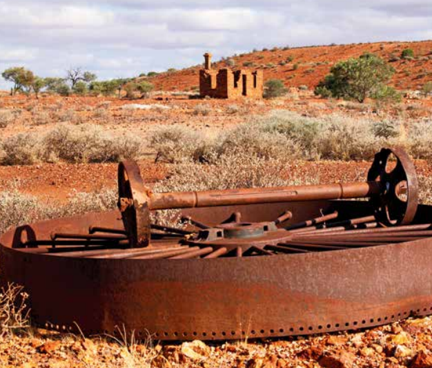 Around 2km away to the south (follow the road towards a communication tower) the more substantial old town brick ruins can be found, including the old Palace Hotel, a bakery and old ovens, a mines offi ce building, some underground cellars, the ruins of an old crushing and processing plant and plenty of old machinery still lying around.