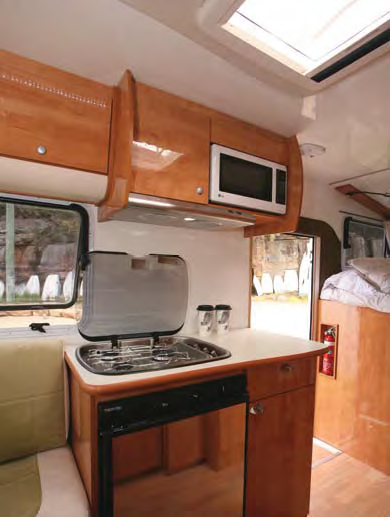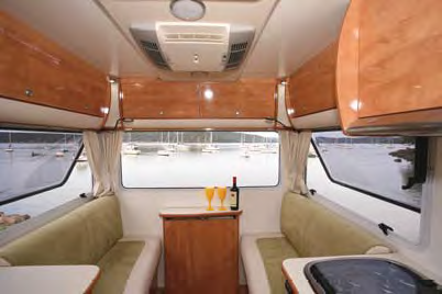 No problem sitting back and relaxing in this rig. With lounges on both sides of a table that slides up and out of the rear cabinet, it’s easy to take in the view from the expansive windows – only the two side windows open, though. Above the seats, overhead lockers deliver a generous amount of convenient storage area, while the under seat areas do the same but in a slightly more awkward fashion.