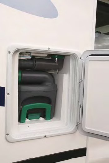 Compact is a good word for the bathroom. It contains a Thetford benchstyle cassette toilet, small corner wash basin and fixed-height flexible hose shower, the outlet of which it shares with the basin. There are towel hooks on the door, as well as a ceiling-mounted rail. Ventilation is handled by a fan hatch on the ceiling. If one was being picky about anything it might be the lack of a bathroom mirror, say, on the outside of the door.