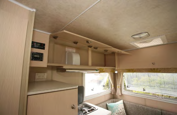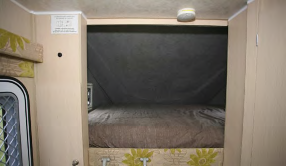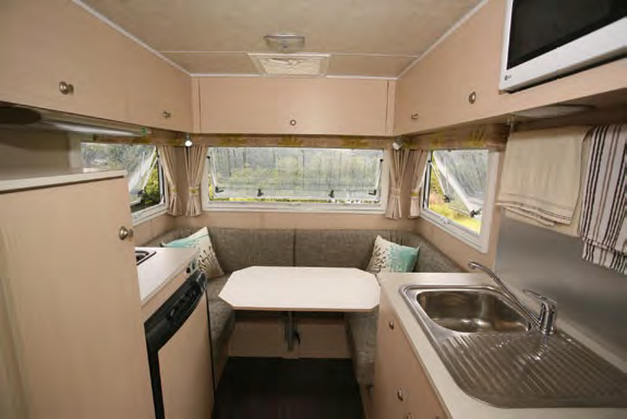 Meal times are going to be relatively simple which is only to be expected in something the size of the Ranger. The offside cabinet adjoining the dinette comes with a two burner cooktop sans grill above and a 90 litre three way fridge below. On the opposite side, the slightly larger kitchen bench there comes with a stainless steel sink avec drainer on top and cupboard space below, along with a cutlery drawer. That leaves the overhead locker area to be where the microwave oven is fitted in.