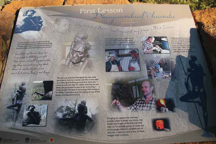 The 1.2 km sculptures walk trail along the top of the gorge to the art works finishes at the mosaic exhibit and visitors have the option of returning along the same trail, or to follow the pathway down into the gorge on a 3km loop trail along Dandry Creek, back to the carpark. This trail extension is also quite an interesting experience with some coloured cliffs, dramatic sandstone outcrops as well as some culturally significant art and axe grinding grooves sites and cave shelters to be seen along the way.