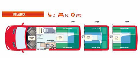 Despite its small stature, the Melaleuca excels with its well thoughtout storage. The main compartment is under the lounge/bed area at the rear, and is accessed from outside via the rear double doors. There’s also a small hatch which allows this space to be accessed from inside, although clever packing is required to make sure you can easily get to what you need. Overhead lockers line the upper reaches of the lounge area and there’s even a narrow drawer underfoot where the floor is stepped – every available space has been utilised!