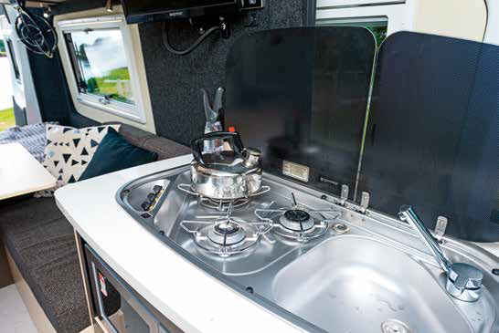 The Melaleuca’s cosy interior has all the essentials for life on the road and given its size, still manages to feel quite spacious. Although, if your travelling companion is at the kitchen bench cooking and you want to use the bathroom, it requires a bit of shuffling about. Kitchen facilities include a three-burner gas cooktop, fuelled by two 4kg gas cylinders, and a sink with a flick mixer tap and a separate filtered drinking water tap on the small nearside bench. Both have glass lids that create precious bench space, and for food preparation there’s an additional bench that lifts up next to the sink, out across the doorway. Next to this bench are the main light switches – nice and easy to get at before you even step inside.