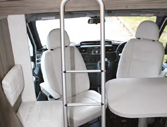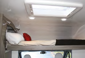 The forward double bed in the Luton peak is accessed via light aluminium step ladder, and (not shown in the images here) will have a security net to avoid a nasty fall off the bed at night. Two reading lights and a large storage cubby sit at the bed head. There are no windows up here; it could possibly benefi t from some natural light and ventilation.