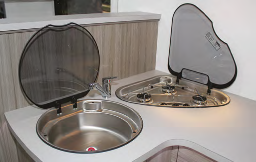 The kitchen has an L-shaped bench which is useful as you can stand next to the thin side of the bench and prepare a meal without blocking the walkway for your better half. Although bench space is not exactly overwhelmingly spacious, there are enough nooks and crannies in addition to the benchtop to make it feel quite roomy. With the fold-up glass covers on the three-burner cooktop and stainless-steel sink shut, and using the small bench to the rear of the kitchen and the top surface of the separating wall between kitchen and dinette, you’ll find quite a bit of space in which to set out your ingredients.