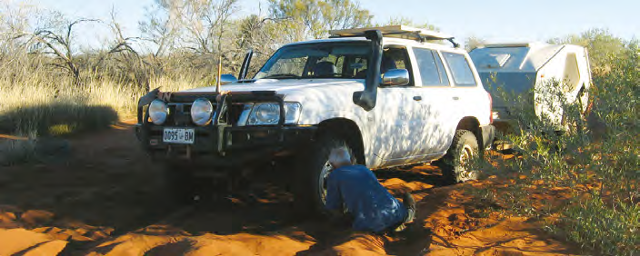 Not bogged – just reducing tyre pressures (note the use of 750 by 16 tyres). Pic: Maarit Rivers – Canning Stock Route 2009